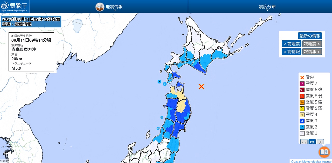 青森県(あおもりけん)・岩手県(いわてけん)で地震(じしん) 2023 9/06 ニュース 社会 2023年8月11日2023年9月6日 11日(にち)午前(ごぜん)9時(じ)14分(ふん)ごろ、青森県(あおもりけん)と岩手県(いわてけん)で最大(さいだい)震度(しんど)4のすこし強(つよ)い地震(じしん)がありました。 地震(じしん)の規模(きぼ)を示(しめ)すマグニチュードは5.9と推定(すいてい)されます。 この地震(じしん)による津波(つなみ)の心配(しんぱい)はありません。 ニュース 社会 よかったらシェアしてね! URLをコピーしました! URLをコピーしました! 台風(たいふう)7号(ごう)が本州(ほんしゅう)に上陸(じょうりく)の可能性(かのうせい) 台風(たいふう)7号(ごう)が近畿(きんき)を縦断中(じゅうだんちゅう) 関連記事 石川県(いしかわけん)を中心(ちゅうしん)に地震(じしん)が続(つづ)く 2024年1月1日 石川県(いしかわけん)で大きな地震(じしん) 2024年1月1日 Amazonや楽天(らくてん)でブラックフライデーセール開催中(かいさいちゅう)! 2023年11月25日 在留外国人(ざいりゅうがいこくじん)が過去最多(かこさいた)322万人(まんにん)に 2023年11月21日 渋谷(しぶや)がハロウィーンの来訪自粛(らいほうじしゅく)を要請(ようせい) 2023年10月23日 新幹線(しんかんせん)「のぞみ」が年末年始(ねんまつねんし)は全席指定(ぜんせきしてい)に 2023年9月14日 アップルがiPhone 15シリーズを発表(はっぴょう) 2023年9月13日 世界(せかい)の報道団体(だんたい)が「世界(せかい)AI原則(げんそく)」を公表(こうひょう) 2023年9月8日