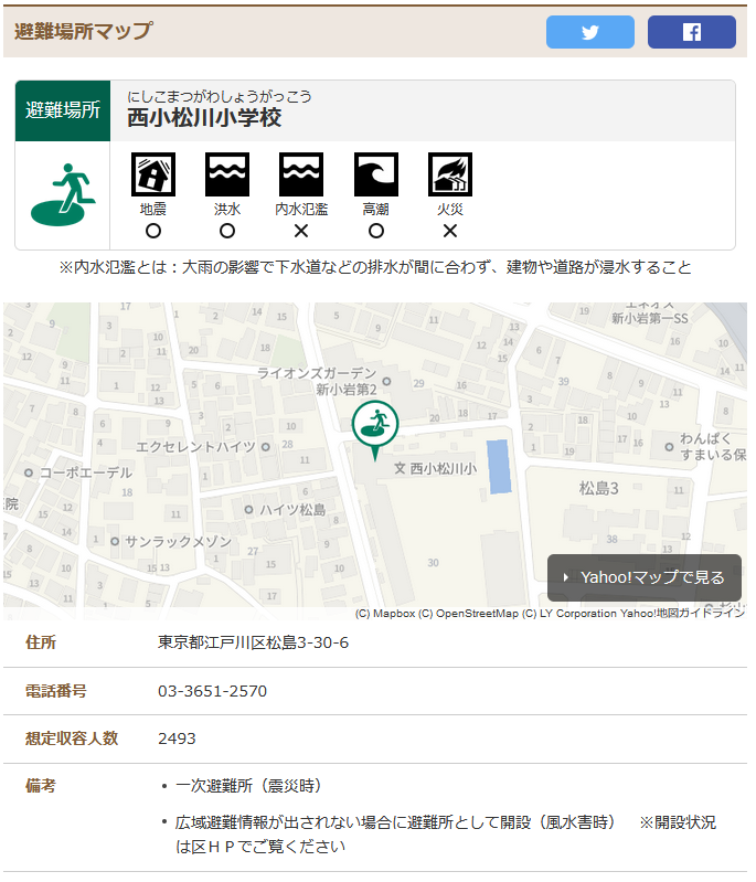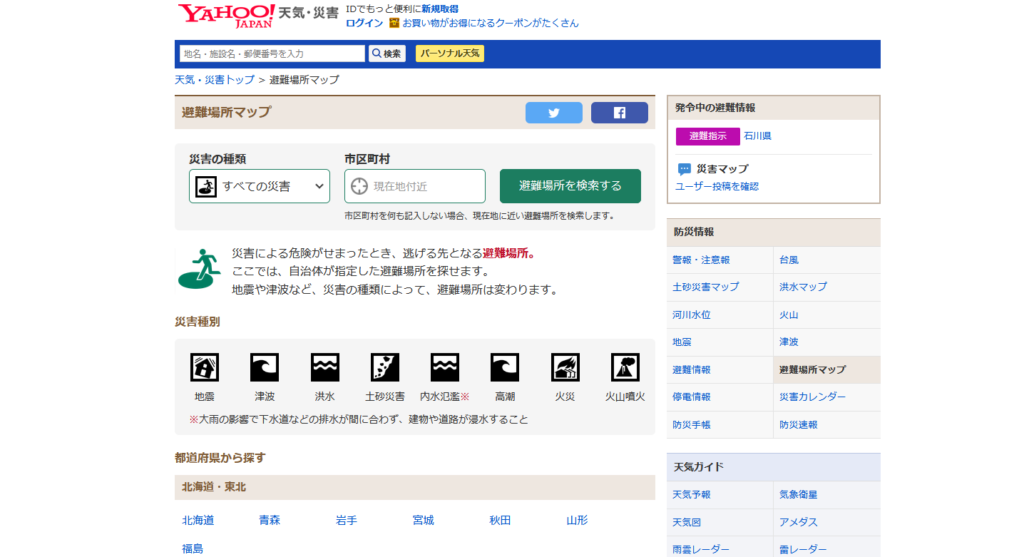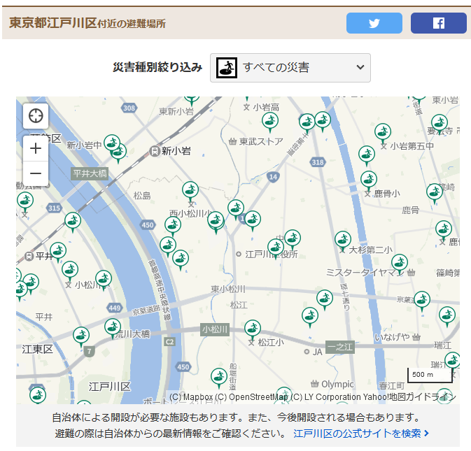※以下、Yahoo!Japan避難所マップ(https://crisis.yahoo.co.jp/map/)のスクリーンショット画像を掲載させていただきます。